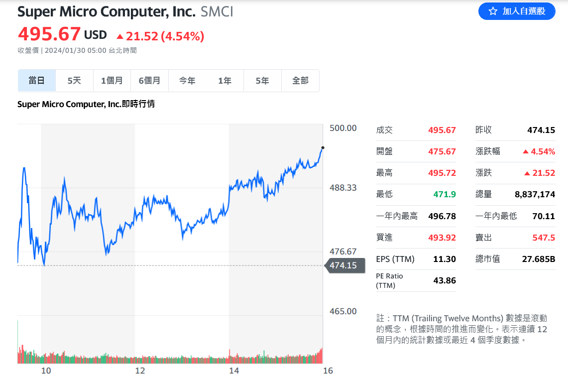 此外,週一(29日)AI伺服器和儲存供應大廠美超微(Super Micro Computer)公佈截至2023年12月31日的2024會計年度Q2財報,營收來到歷史新高36.6億美元、年增103%,遠高於市場預期;美超微電腦執行長梁見後更提高全年財測,激勵其股價勁揚4.54%,收495.67美元,盤後更續漲逾10%。