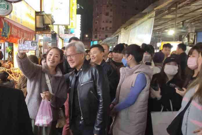 黃仁勳此次訪臺出現在寧夏夜市,對民眾邀約合影親切回應。圖片來源:寧夏夜市自治會